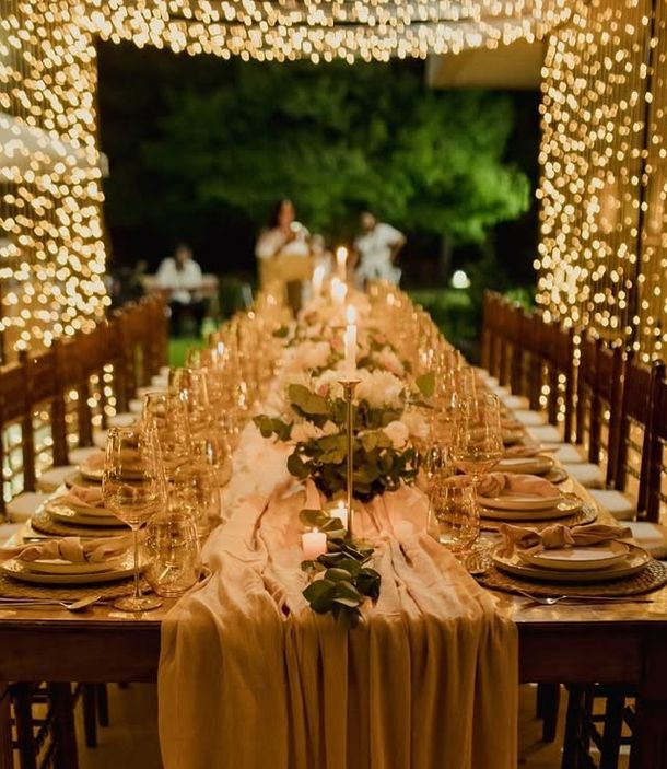 El festejo se llevó a cabo en un espacio al aire libre que combinó elegancia y clima veraniego. Luces led colgantes, mesas delicadamente armadas y una ambientación cálida hicieron que el sitio pareciera sacado de Pinterest.