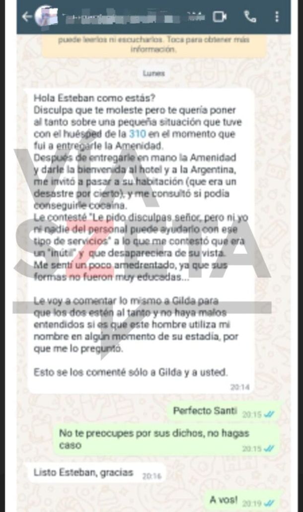 En el chat de whatsapp al que hace referencia el jefe de la recepción del hotel, se puede ver que el 16 de octubre de este 2024, mismo día que falleció, pero a las 12:31 del mediodía, él le escribió a Roger Nores: "Sólo a modo informativo vinieron éstas chicas a su habitación. Se le subió un champagne y solicitó dos botellas de Johnny Walker". Ante esto, a las 12:36 llega la respuesta cauta de Nores: "Muchísimas gracias Esteban".