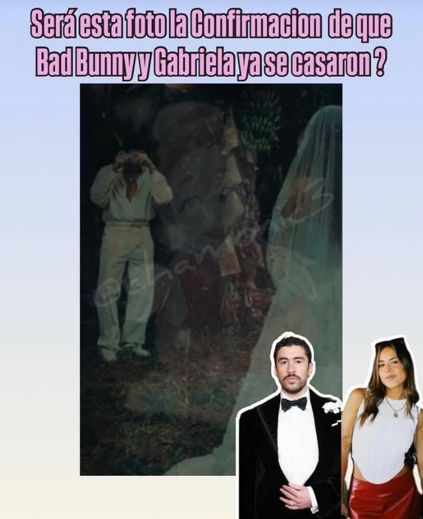 La imagen fue compartida por una creadora de contenido conocida como “Chamonic”, en la que aparece un hombre con traje claro junto a una mujer con vestido de novia vista de espaldas. “Vaya vaya…. Vean bien. Será esta foto la confirmación de que Bad Bunny y Gabriela ya se casaron?“, comentó la influencer. Aunque varios usuarios interpretan que podría tratarse de Bad Bunny y Gabriela, no existe confirmación oficial de que la fotografía represente una boda real de la pareja.