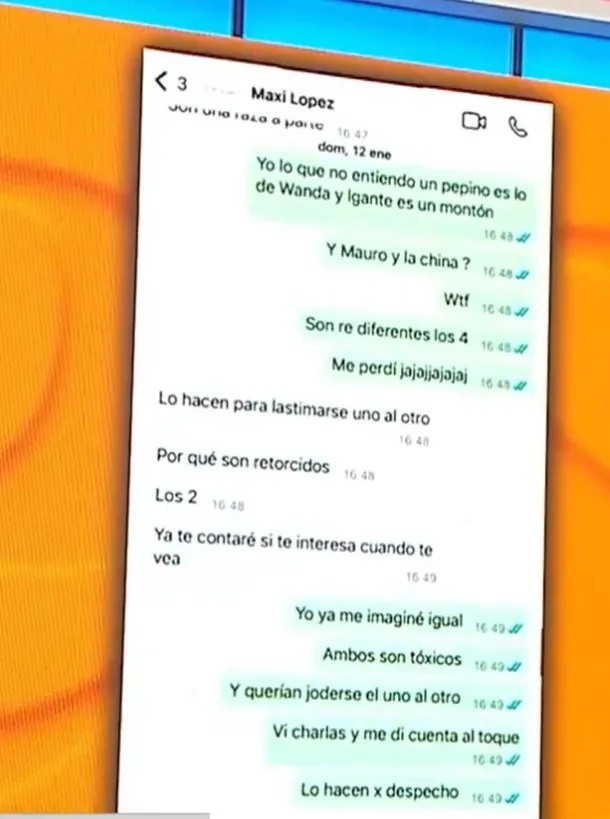 En una de las conversaciones, Martínez planteó su sorpresa ante la relación de Nara con L-Gante y la de Icardi con la China Suárez, ya que le parecía que todos eran muy distintos. Ante esto, López respondió: "Lo hacen para lastimarse el uno al otro porque son retorcidos los dos. Ya te contaré, si te interesa, cuando te vea".