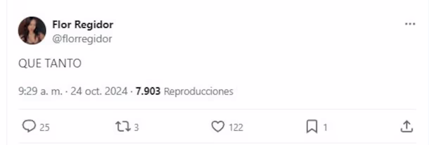 Finalmente, la ex participante de Gran Hermano 2023 rompió el silencio y publicó su descargo en X, donde es muy activa y suele comentar sobre lo que le sucede. Su forma de abordar el tema fue contundente y definitiva, expresando: "¿QUÉ TANTO?", escribió, destacando su mensaje con letras mayúsculas. Con solo dos palabras, logró transmitir su fastidio.