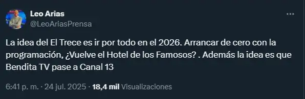 A raíz de este episodio y otros conflictos acumulados, el periodista Leo Arias difundió a través de su cuenta en X una versión que sacudió al mundo televisivo: “La idea de El Trece es arrancar desde cero en 2026. Podría sumarse Bendita TV a su grilla”. Si bien no hay confirmación oficial, Casella admitió que tiene varias propuestas sobre la mesa.
