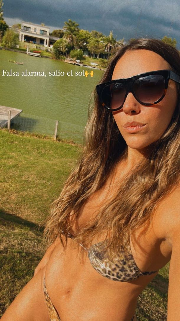 La actriz, modelo y conductora se mostró en redes sociales con un traje de baño y lentes de sol junto a una pileta en medio del clima inestables del AMBA.