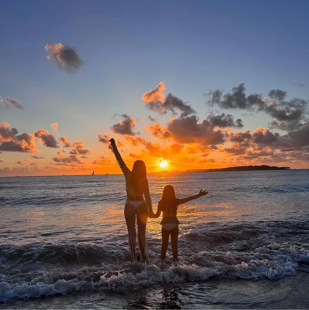 En algunas de las imágenes, se mostró muy tierna junto a su hija pequeña. La nena posó de la mano de su mamá con una bikini estampada con top y volados en la bombacha.