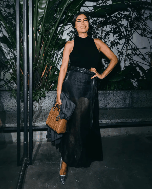 Con un look clásico combinó la prenda con un top sin mangas y cuello alto del mismo color. Como accesorios sumó un cinto negro trenzado para marcar la cintura, stilettos plateados con brillos y el famoso modelo de minibag Lady Dior de la famosa firma francesa en color camel.