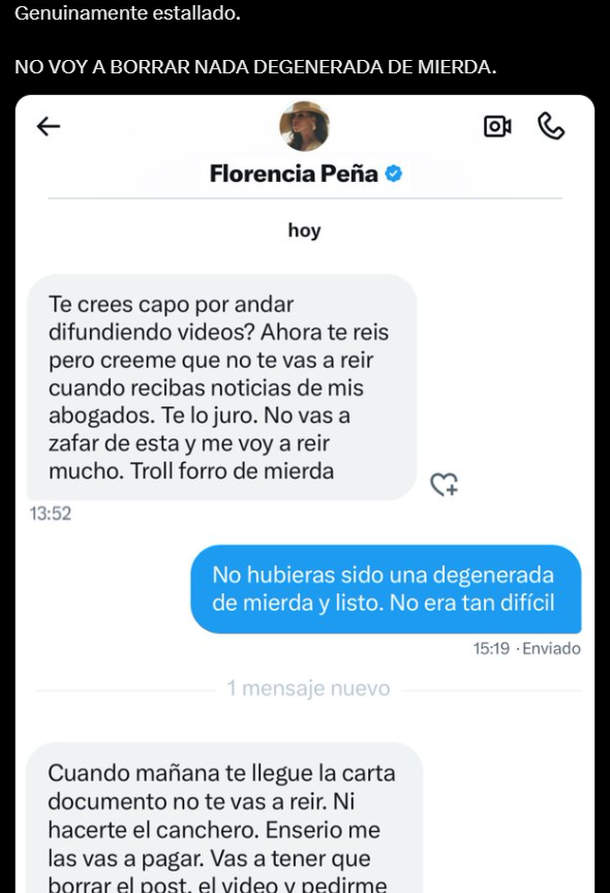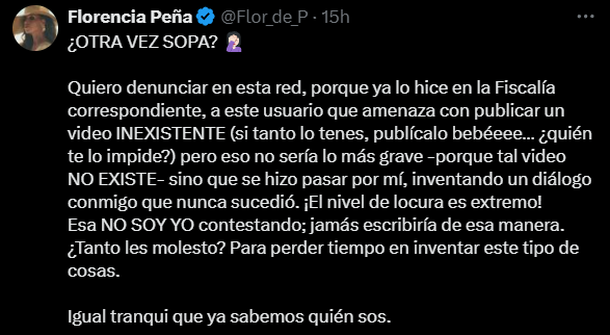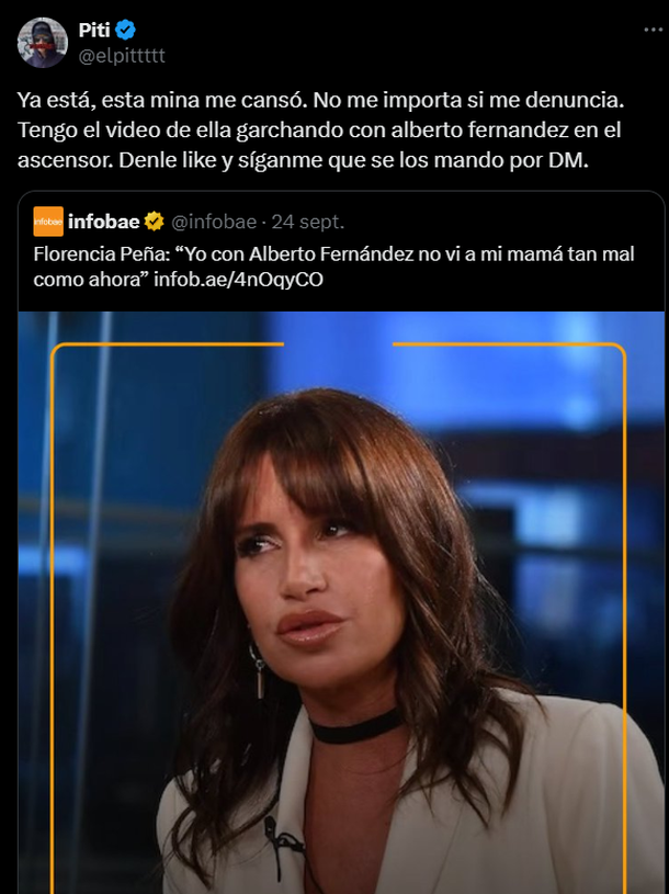 Florencia Peña presentó una denuncia ante la Justicia luego de recibir mensajes en la red social X en los que se la amenazaba con difundir un supuesto video íntimo que la vincularía con el expresidente de la Nación, Alberto Fernández.