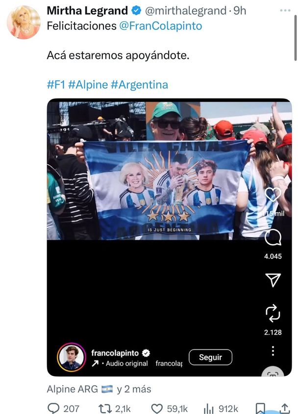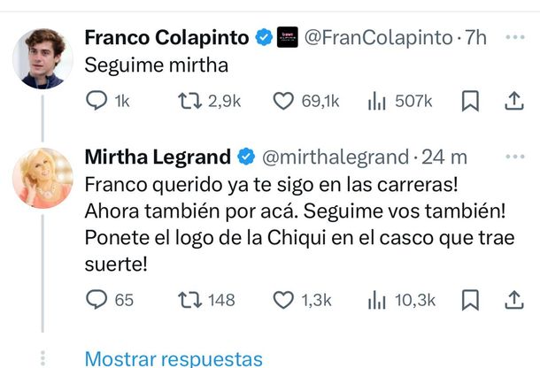 Lejos de dejar pasar el gesto, Colapinto respondió con humor y espontaneidad, escribiéndole directamente: “Seguime Mirtha”. El simpático pedido no pasó desapercibido y causó furor entre los seguidores de ambos, generando cientos de comentarios y compartidos.