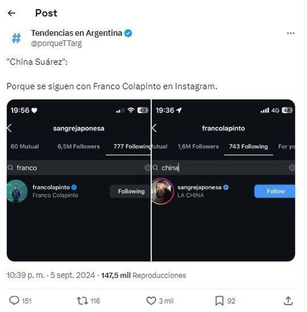 “Fue mi momento más orgulloso desde que tengo Instagram y le dice alejate... no che”, escribió Franco en a red social X, aunque poco después decidió arrepentirse y borrar el mensaje. El piloto hizo referencia a la reacción de la gente quien, teniendo en cuenta las polémicas de la actriz en el pasado, le pidieron que no se acerque al joven.