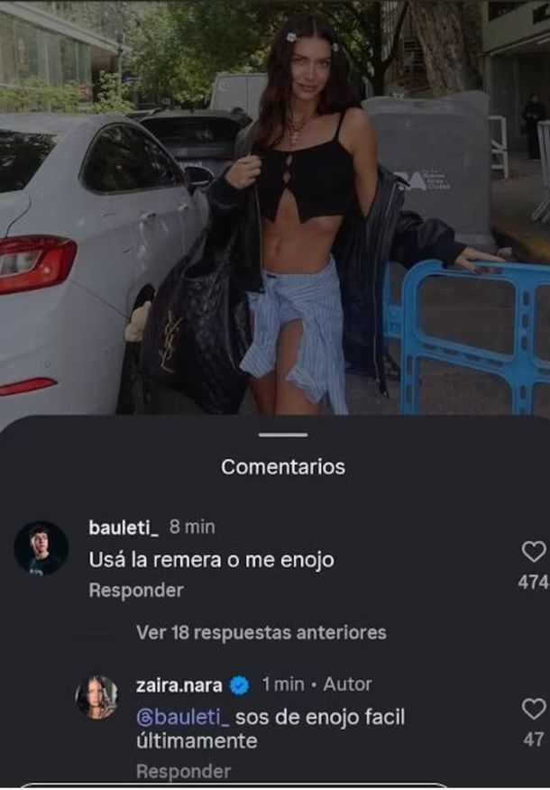 La chispa inicial se encendió con un intercambio que no tardó en viralizarse. Santiago Baietti, conocido como Bauletti, escribió sin filtro: “Usá la remera o me enojo”. La respuesta de Zaira Nara no se hizo esperar: “Sos de enojo fácil últimamente”. El diálogo, centrado en una remera con el rostro del streamer, se transformó en el nuevo episodio de un juego público lleno de insinuaciones.