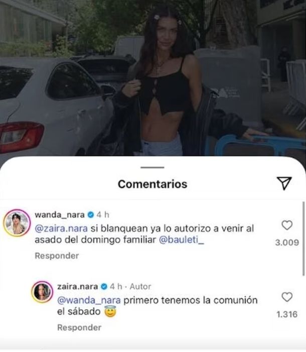 Pero el ida y vuelta tomó otra dimensión cuando Wanda Nara intervino con su estilo inconfundible. La mediática lanzó una frase que rápidamente recorrió los portales: “Si blanquean, ya lo autorizo a venir al asado del domingo familiar”. La respuesta de Zaira, igualmente ingeniosa, no se hizo esperar: “Primero tenemos la comunión el sábado”, dejando claro que los compromisos familiares siguen siendo prioridad.