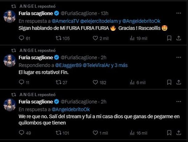 Ante la repercusión mediática, Juliana Furia no dudó en salir a aclarar su postura a través de su cuenta en X (anteriormente conocida como Twitter), desmintiendo la versión de De Brito. "Salí del stream y me fui a mi casa. Dios, qué ganas de generar quilombos tienen", expresó, defendiendo su decisión de irse.