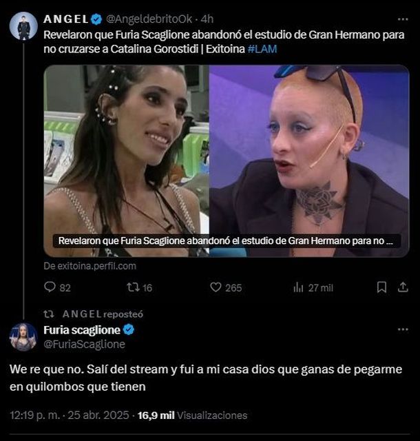 Juliana "Furia" Scaglione salió al cruce de los rumores que indicaban que había dejado el debate de Gran Hermano para evitar encontrarse con Catalina Gorostidi. La ex participante del reality desmintió categóricamente las acusaciones, apuntando directamente a LAM (América) y a Ángel de Brito por lo que consideró una "falsa acusación".