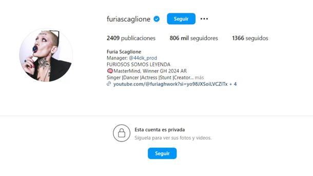 Con no solamente confirmaron que ninguna de las dos se tiene en su perfil de Instagram, sino que además mostraron una seria decisión de la ex hermanita. Esto es porque, así como se puede comprobar entrando en su cuenta oficial, Furia optó por poner su usuario en la red social de la camarita privado, a diferencia del resto de sus ex compañeros del show de Telefe.