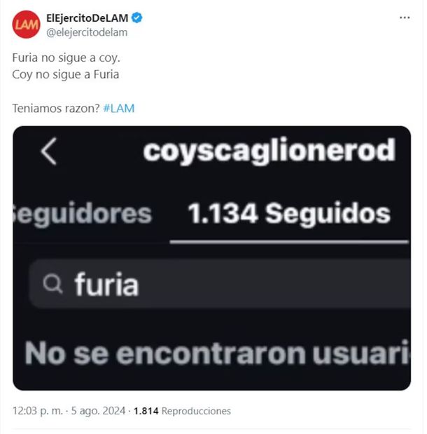 Los primeros indicios de este distanciamiento entre las Scaglione los reveló LAM. Eso sí, a pesar de que hasta el momento no se había confirmado nada, ahora desde la cuenta oficial de X volvieron a hablar del tema mostrando una captura de pantalla que acreditaría lo sucedido. “Furia no sigue a Coy. Coy no sigue a Furia. ¿Teníamos razón?”, escribieron.