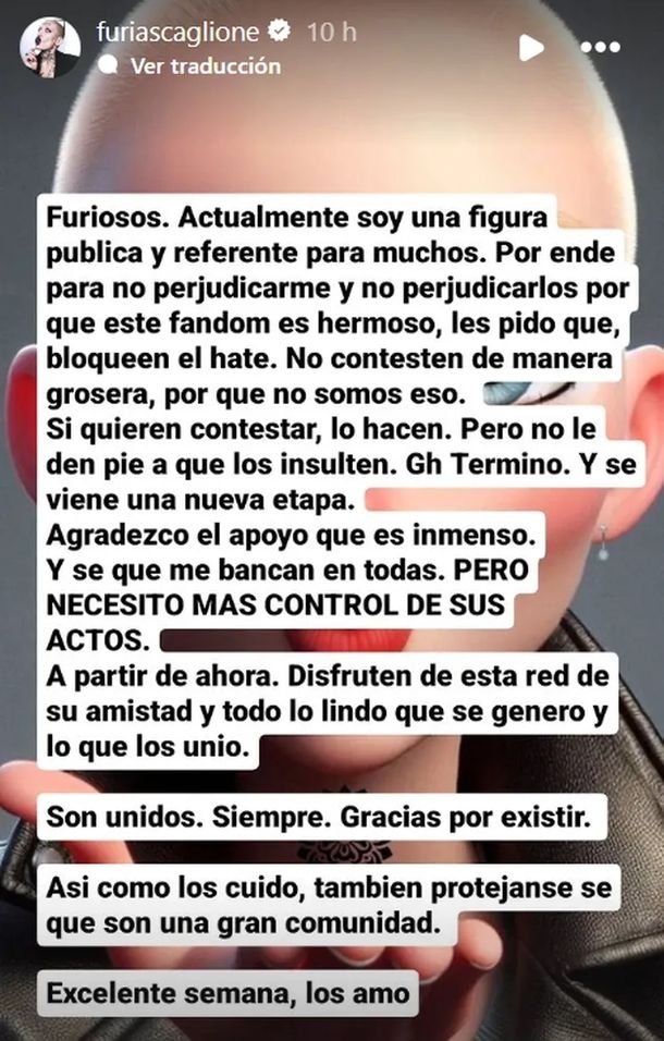 A través de su historia en Instagram, la polémica exjugadora le pidió a quienes la siguen que no respondan "al hate". Con un mensaje dedicado a los "furiosos", como ella los bautizó, les dijo: "Actualmente soy una figura pública y referente para muchos. Por ende, para no perjudicarme y perjudicarlos, porque este fandom es hermoso, les pido que bloqueen el hate", comenzó diciendo.