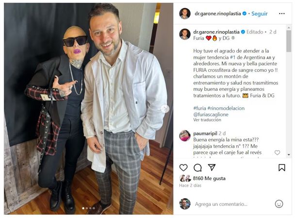 “Hoy tuve el agrado de atender a la mujer tendencia #1 de Argentina y alrededores. Mi nueva y bella paciente Furia, crossfitera de sangre como yo. Charlamos un montón de entrenamiento y salud nos trasmitimos muy buena energía y planeamos tratamientos a futuro”, escribió el cirujano. Ante esto, procedió a explicar cuál será su relación a partir de ahora.