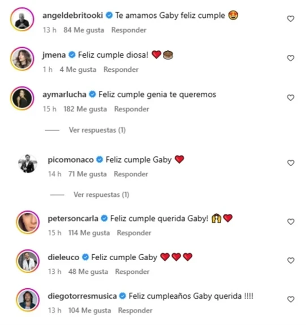 "Te amamos Gaby, feliz cumple", le escribió Ángel de Brito, mientras que otra referente indiscutida del deporte argentino, Luciana Aymar, también le dedicó unas palabras: "Feliz cumple genia, te queremos." A esos mensajes se sumaron los de celebridades como Carla Peterson, Diego Torres, Jimena Barón, Diego Leuco, entre otros, quienes hicieron llegar su cariño y admiración a través de las redes.