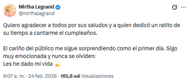 Tras el festejo, la conductora publicó un mensaje en la red social X para agradecer el amor que recibió durante su aniversario: “Quiero agradecer a todos por sus saludos y a quien dedicó un ratito de su tiempo a cantarme el cumpleaños”, dijo. Luego agregó: “El cariño del público me sigue sorprendiendo como el primer día. Sigo muy emocionada y nunca se olviden: Les he dado mi vida”.