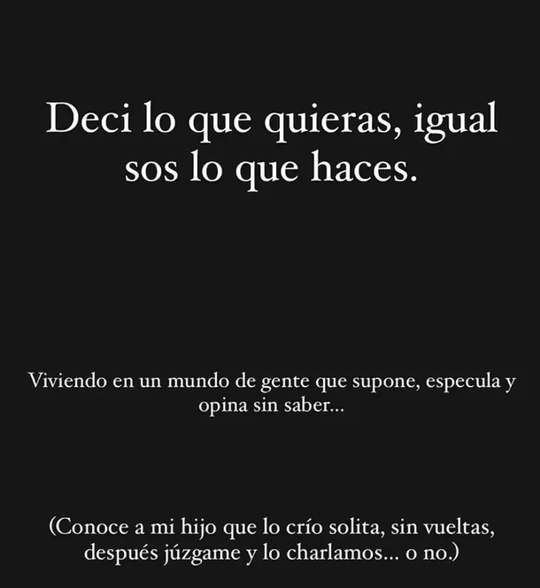 Sin revelar más detalles de a quién va dirigido el descargo, la hija de Claudia Villafañe cerró: “Conocé a mi hijo que lo crío sin vueltas, después juzgame y lo charlamos, o no...”.