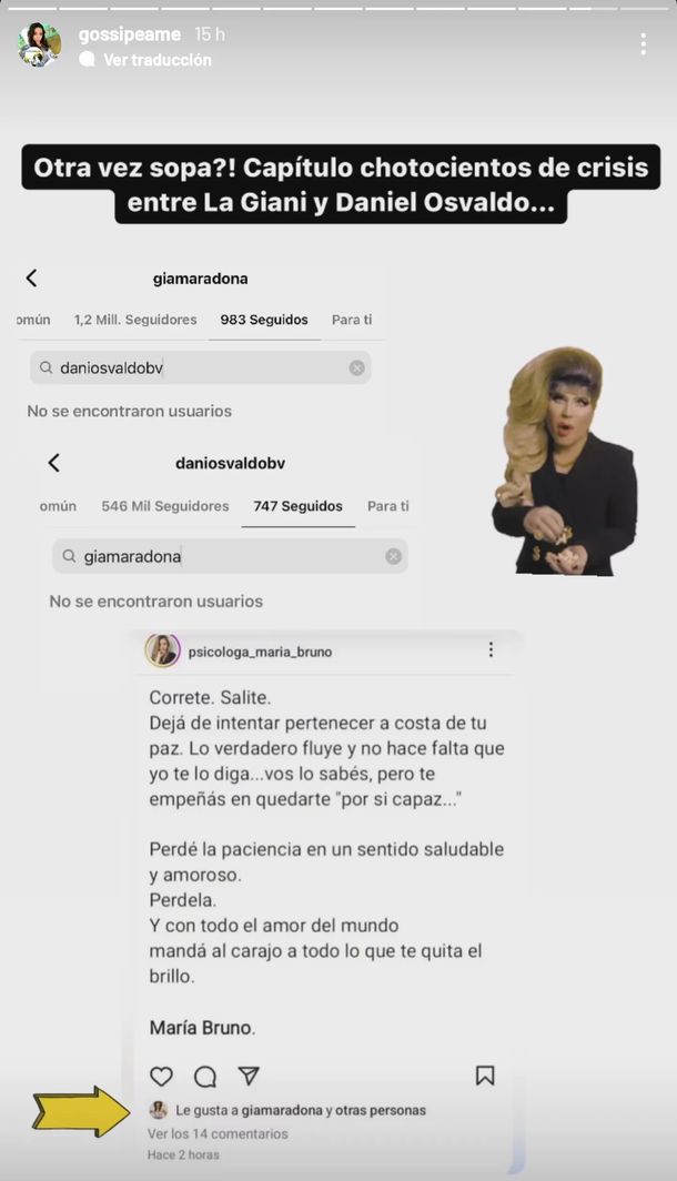 Además de ese gesto virtual, Gianinna le dio “me gusta” a una curiosa publicación de una psicóloga. “Con todo el amor del mundo, mandá al caraj... a todo lo que te quita el brillo”, dice el mensaje que aparece en el posteo. “Correte, salite. Dejá de intenta pertenecer a costa de tu paz, lo verdadero fluye”, expresa la frase.