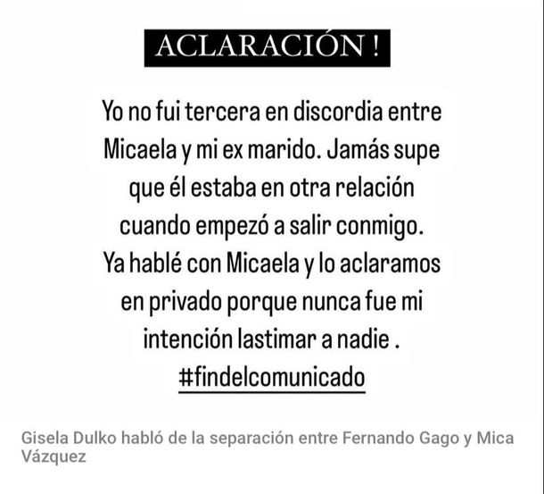 Mediante las historias de Instagram, Dulko realizó su descargo y dijo: "Yo no fui tercera en discordia entre Micaela y mi exmarido. Jamás supe que él estaba en otra relación cuando empezó a salir conmigo", deslizó tajante. Y agregó: "Ya hablé con Micaela y lo aclaramos en privado porque nunca fue mi intención lastimar a nadie. #findelcomunicado".