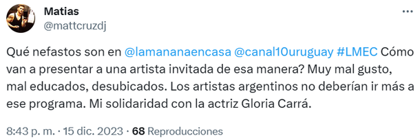 Por supuesto, Gloria Carrá no fue la única indignada por la desubicación del magazine uruguayo. Varios espectadores se mostraron molestos por lo sucedido y uno de ellos lo expresó en redes, sin pelos en la lengua: "Nefastos".
