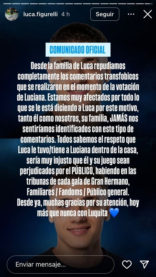 Ante esto, la familia del joven se manifestó en el Instagram del participante: "Desde la familia de Luca repudiamos completamente los comentarios transfóbicos que se realizaron en el momento de la votación de Luciana. Estamos muy afectados por todo lo que se le está diciendo a Luca por este motivo, tanto él como nosotros, su familia, JAMÁS nos sentiríamos identificados con este tipo de comentarios", comenzaron escribiendo.