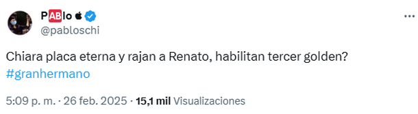 Si bien algunos lo suponían, "Pabloschi" -uno de los máximos referentes en X del reality show- lanzó las duras sanciones que se vienen en la gala de este miércoles: "Chiara placa eterna y rajan a Renato, ¿habilitan tercer Golden?", escribió, anticipando el reingreso de un tercer exparticipante.