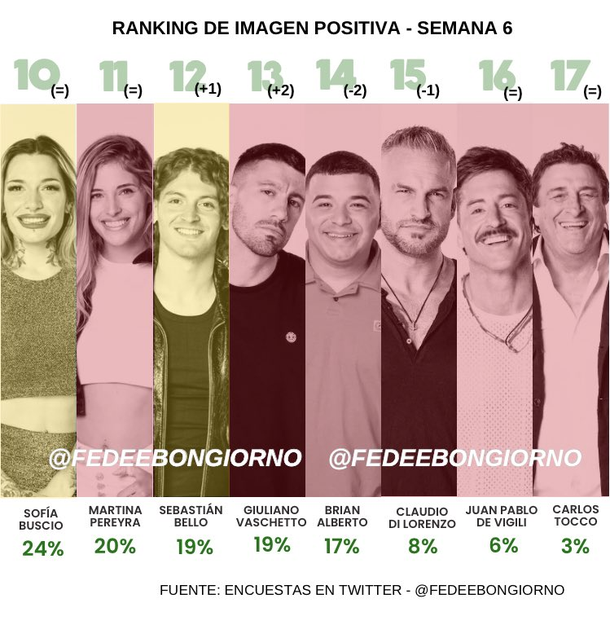 Por otro lado, los menos queridos son Brian Alberto -recientemente reingresado al juego-, Claudio Di Lorenzo, Juan Pablo De Vigili y Carlos Tocco.