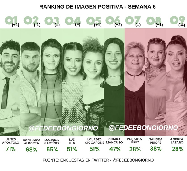 Hasta el momento, el primer puesto lo ocupaba Santiago Algorta, que ahora quedó desplazado hacia el segundo lugar. Luego le siguen sus amigas: Luciana Martínez y Luz Tito. En tanto, en quinto lugar se ubica Lourdes Ciccarone, otra de las sorpresas de esta edición.