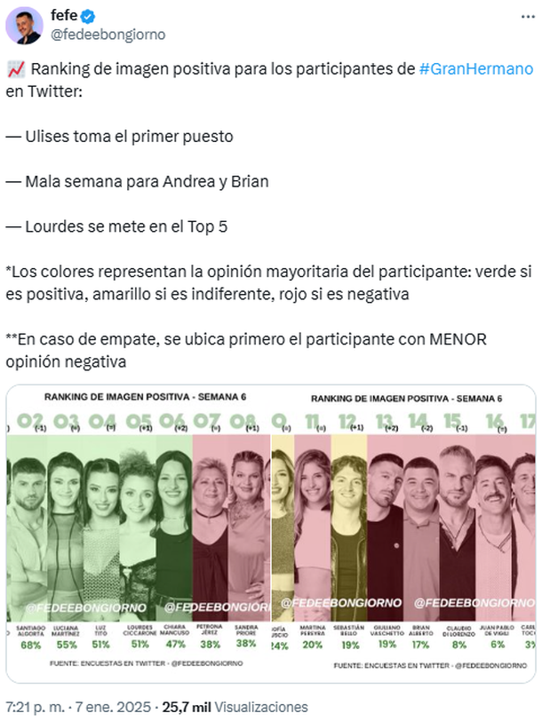 De hecho, Federico se encarga de hacer todas las semanas diferentes preguntas a los usuarios de Instagram y X. En esta oportunidad, volvió a realizar el ranking de imagen positiva de los jugadores, consultando a qué participante prefiere la gente.