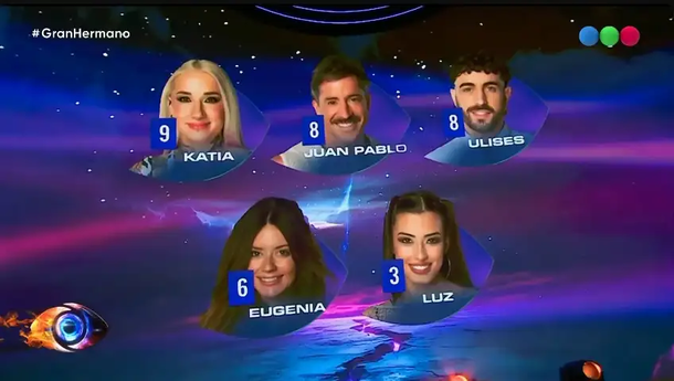 En la gala, se definieron los nominados que podrían abandonar la casa en la próxima eliminación: Katia fue la más votada con 9 votos, seguida por Juan Pablo y Ulises con 8, y Eugenia con 6. Luz también recibió votos (3), pero logró evitar la placa y se convirtió en una de las últimas seis participantes junto a Tato Algorta, quien no recibió votos y sigue perfilándose como uno de los favoritos del público.