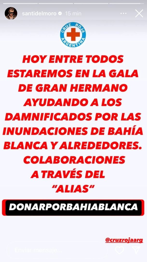 En esta oportunidad, Santiago del Moro, conductor de Gran Hermano, anunció que esta gala será exclusivamente para ayudar. A través de una historia de Instagram y arrobando a la Cruz Roja (@cruzrojaarg) expresó: "Hoy entre todos estaremos en la gala de Gran Hermano ayudando a los damnificados por las inundaciones de Bahia Blanca y alrededores" y sumó que las mismas serán a través del alias: "DONARPORBAHIABLANCA"