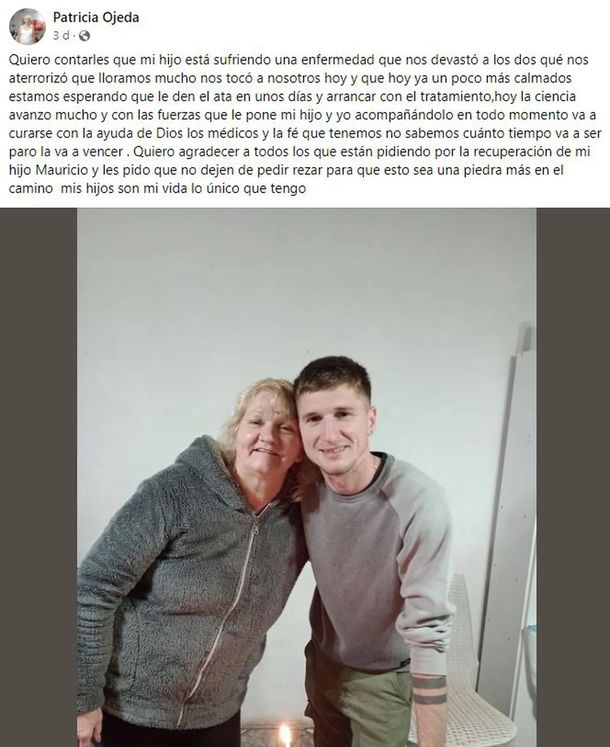 “Quiero contarles que mi hijo está sufriendo una enfermedad que nos devastó a los dos, qué nos aterrorizó, que lloramos mucho”, escribió Patricia Ojeda, junto a una foto con Mauricio, que publicó en su cuenta de Facebook.