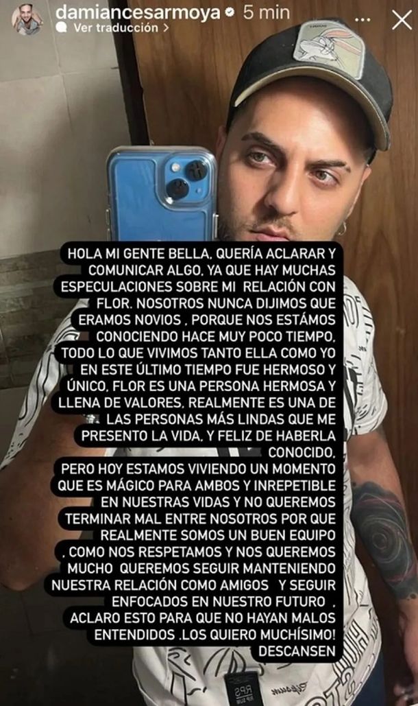 “Hola mi gente bella, quería aclarar y comunicar algo. Ya que hay muchas especulaciones sobre mi relación con Flor. nosotros nunca dijimos que éramos novios, porque nos estamos conociendo hace muy poco tiempo”, descartó Damián.