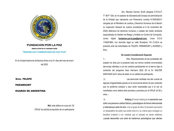 A través de un comunicado, la Fundación por la Paz presentó contra la producción de Gran Hermano un amparo ya que consideran que Ariel sufre bullying por parte de Alfa desde su ingreso a la casa y se plantea una situación terminante: su expulsión.