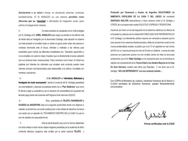 En tanto, explicaron que gran parte del público del exitoso reality de Telefe está integrado por personas mayores de 55 años y son quienes han “remitido cientos de miles de denuncias proclamando que el Sr. Wálter Santiago no los representa toda vez que se adjudicó ser representante de la tercera edad y los adultos mayores de la casa”.