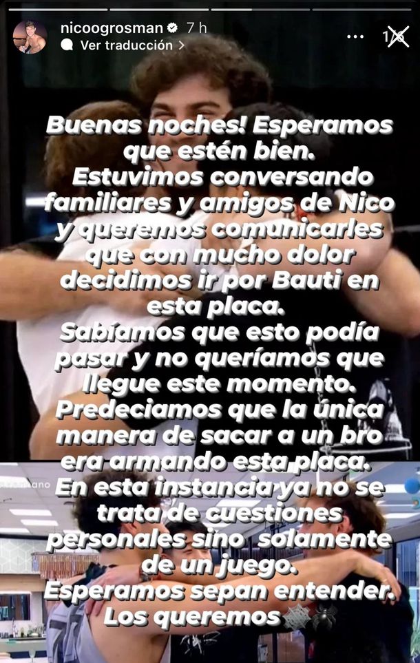 Tal es el caso de la familia de Nicolás Grosman, la cual se pronunció en el Instagram del joven: "Buenas noches, esperamos que estén bien. Estuvimos conversando familiares y amigos de Nico y queremos comunicarles que, con mucho dolor, decidimos ir por Bauti en esta placa", comenzaron escribiendo.