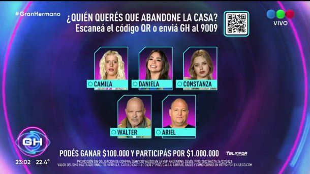 Daniela, Coti, Camila, Walter "Alfa" y Ariel son los que podrán ser eliminados en esta gala. Esta semana la salvación del líder Thiago fue eliminada por Gran Hermano por haberle anticipado su decisión a "Pestañela".
