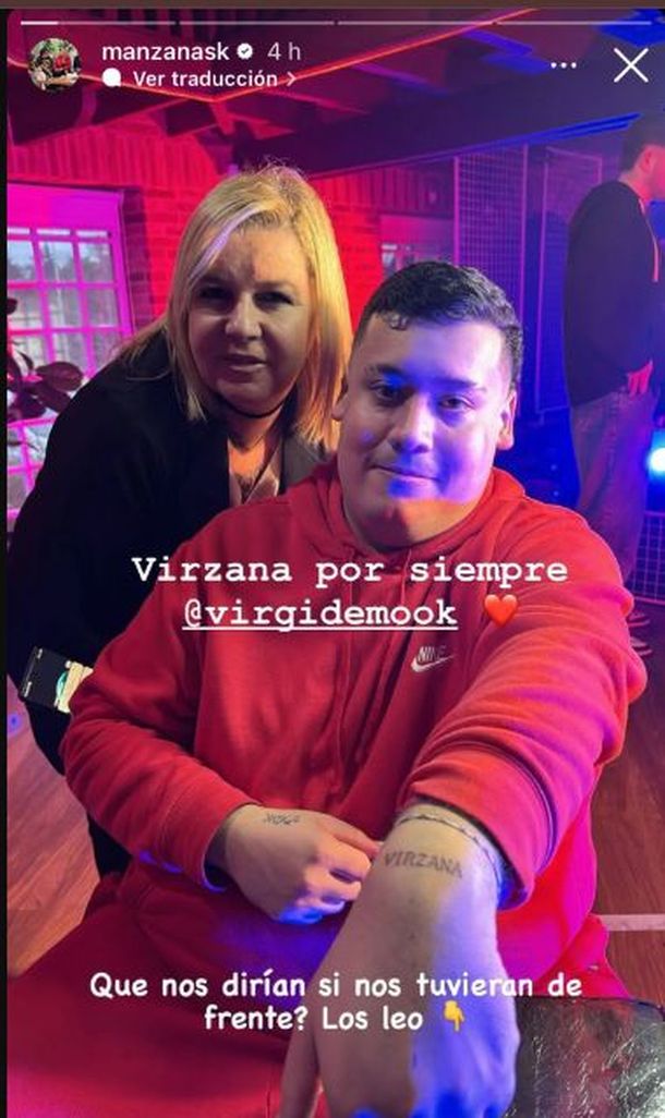 Y ahora, la combinación del apodo de Federico, Manzana, con el nombre de Virginia, se encuentra en la piel de él. Por eso, para celebrarlo, ambos se mostraron juntos en redes sociales una vez más y haciendo foco a este tatuaje en honor a su amistad. El mismo se encuentra en la mano izquierda de Manzana, quien para acompañar la postal que publicó para mostrarlo, escribió: “Virzana por siempre @virginiademook. ¿Qué nos dirían si nos tuvieran de frente?".