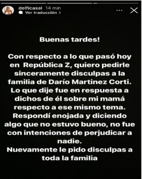 Después de las repercusiones que tuvo el posteo, Delfina, para evitarse cualquier tipo de demanda escribió en sus redes: "Con respecto a lo que pasó hoy en República Z, quiero pedirles sinceramente disculpas a la familia de Darío Martínez Corti".