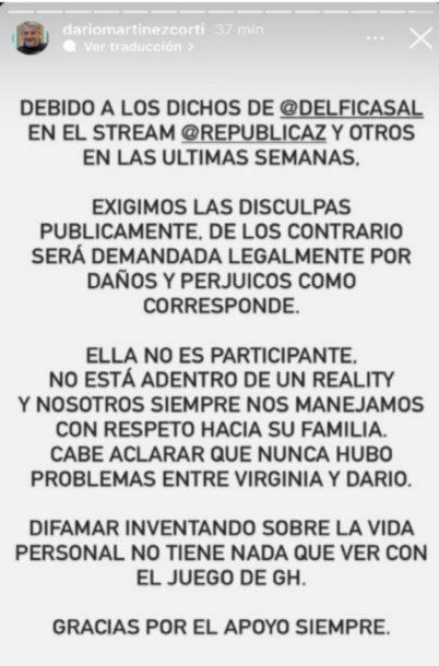 Y, agregaron: "De lo contrario será demandada legalmente por daños y perjuicios como corresponde. Ella no es participante, no está dentro de un reality y nosotros siempre nos manejamos con respeto hacia su familia. Cabe aclarar que nunca hubo problemas entre Virginia y Darío. Difamar inventando sobre la vida personal, no tiene nada que ver con el juego de GH".