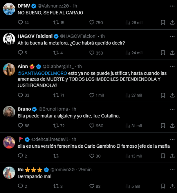 Durante la jornada de este sábado, Furia tuvo una conversación con Emmanuel que disgustó a los seguidores del programa que conduce Santiago del Moro. Luego de que el joven que ahora le es fiel dijera que quería que se terminara el día, Juliana lanzó sin pruritos: "Yo quiero que mi hermana Coy me traiga un arma así le pego un tiro en la pierna a la conch... esa", disparó.