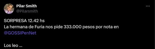 Esto es porque en su cuenta de X, Smith reveló que, para acceder a esta entrevista, la hermana de Furia de GH le solicitó dinero. "Sorpresa a las 12.42 hs. La hermana de Furia nos pide 333.000 pesos por una nota", fueron las palabras exactas de la periodista.