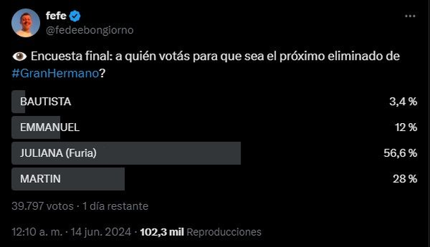 En la encuesta de Fefe Bongiorno, uno de los especialistas de Gran Hermano, votaron un total de 40.000 personas quienes eligieron a Juliana como la que abandona la casa. Con un total de 56.6% de los votos, Furia fue la más votada, mientras que Martín Ku quedó en segundo puesto con el 28% de los votos. Al mismo tiempo, en esta encuesta, Emanuel sumó un 12% y, por último, Bautista un 3.4% siendo así uno de los favoritos para quedarse.