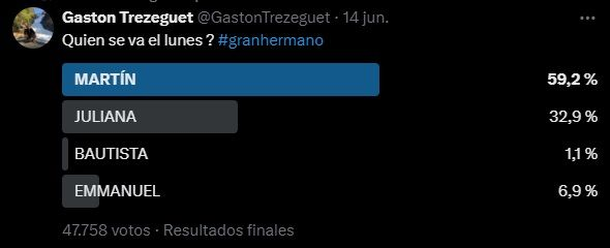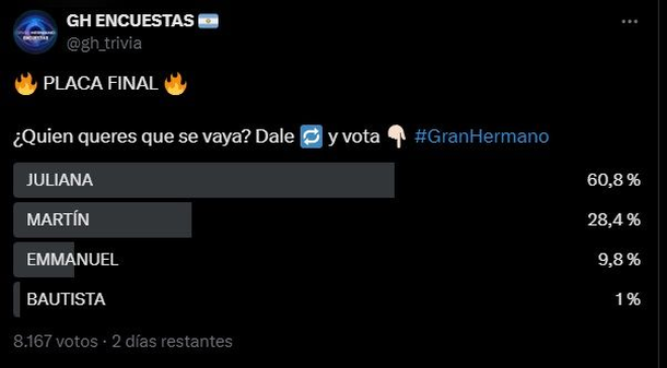 Por su parte, @gh_trivia, una de las cuentas más especializadas en lo que a encuestas de Gran Hermano se refiere, llegaron un total de 8.000 votos. En esta ocasión, los votantes también escogieron a Furia como la futura eliminada del certamen con un 60.8% de los votos y, al igual que en la de Federico, Martín Ku se quedó con el segundo puesto con el 28.4% de los votos. Emanuel, por otro lado, volvió al tercer puesto con un 9.8%.