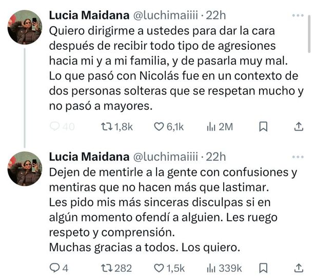 Antes de esto, Lucía había utilizado su cuenta de la red social X para empezar a descargarse: “Quiero dirigirme a ustedes para dar la cara después de recibir todo tipo de agresiones hacia mí y a mi familia, y de pasarla muy mal. Lo que pasó con Nicolás fue en un contexto de dos personas solteras que se respetan mucho y no pasó a mayores”.