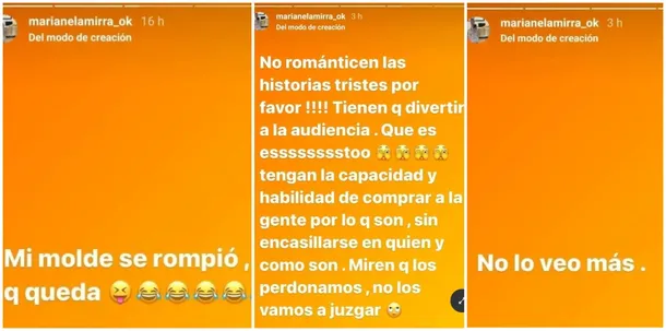 "¡No romanticen las historias tristes, por favor! ¡Tienen que divertir a la audiencia! ¿Qué es esto? Tengan la capacidad y habilidad de comprar a la gente por lo que son, sin encasillarse en quién y cómo son. Miren que los perdonamos, no los vamos a juzgar”, criticó.