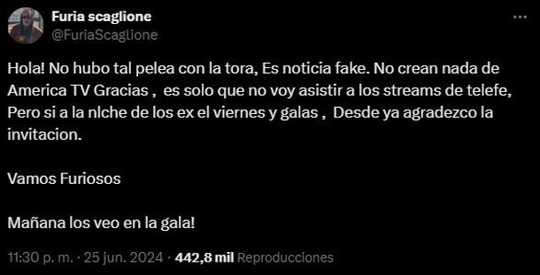 Luego de que LAM revelara la pelea de Furia y la Tora, la polémica exparticipante de la última edición salió a responder: "Hola! No hubo tal pelea con La Tora. Es noticia fake". Y agregó: "No crean nada de América TV. Gracias, es solo que no voy a asistir a los streams de Telefe, pero sí a La Noche de los Ex el viernes y las galas".