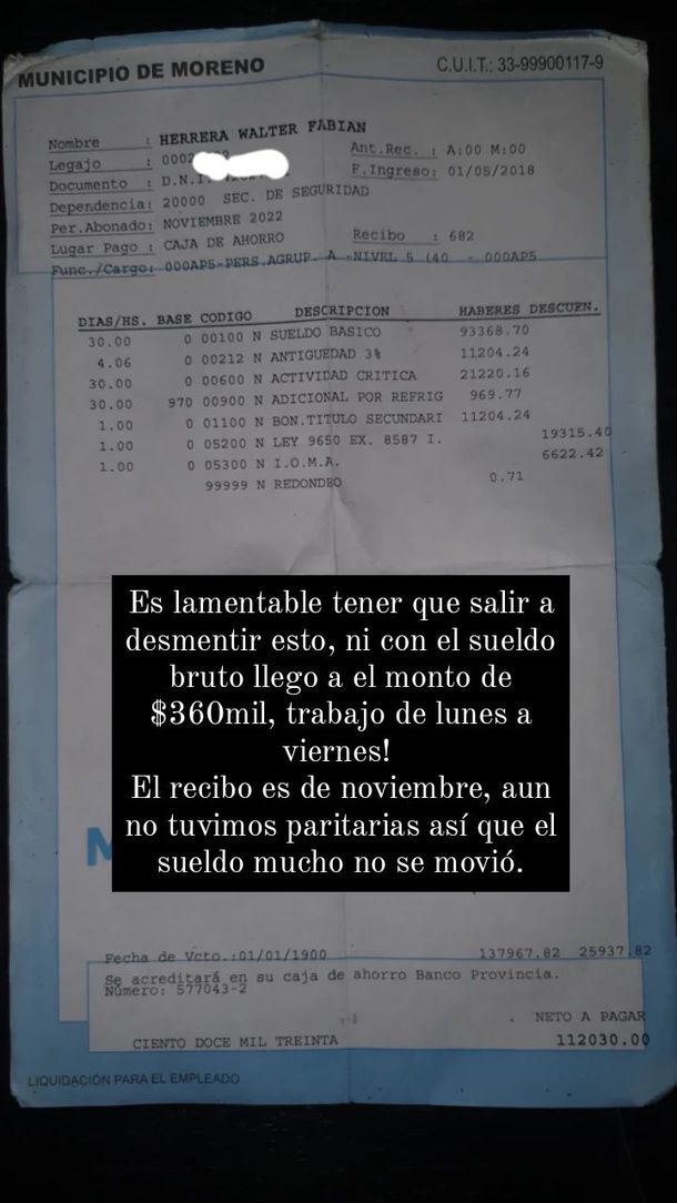 Herrera fue víctima de trolleo. Circuló en redes sociales que cobraba 360 mil pesos en Moreno. En las últimas horas posteó su recibo de sueldo. "Ni con el bruto llego a ese monto", dijo quien se desempeña en la Secretaría de Seguridad.